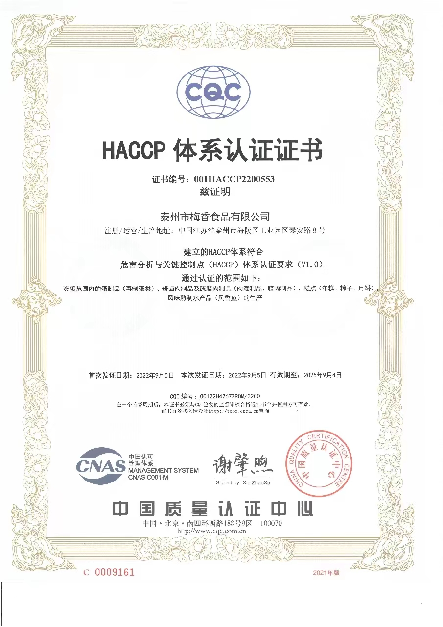 食品安全管理體系認證(2022年9月5日至2025年9月4日)